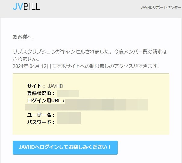 「JAVHDへのサブスクリプションはキャンセルされました」というタイトルのメールが届いているはずです(無いときは迷惑メールに入っている可能性があります)