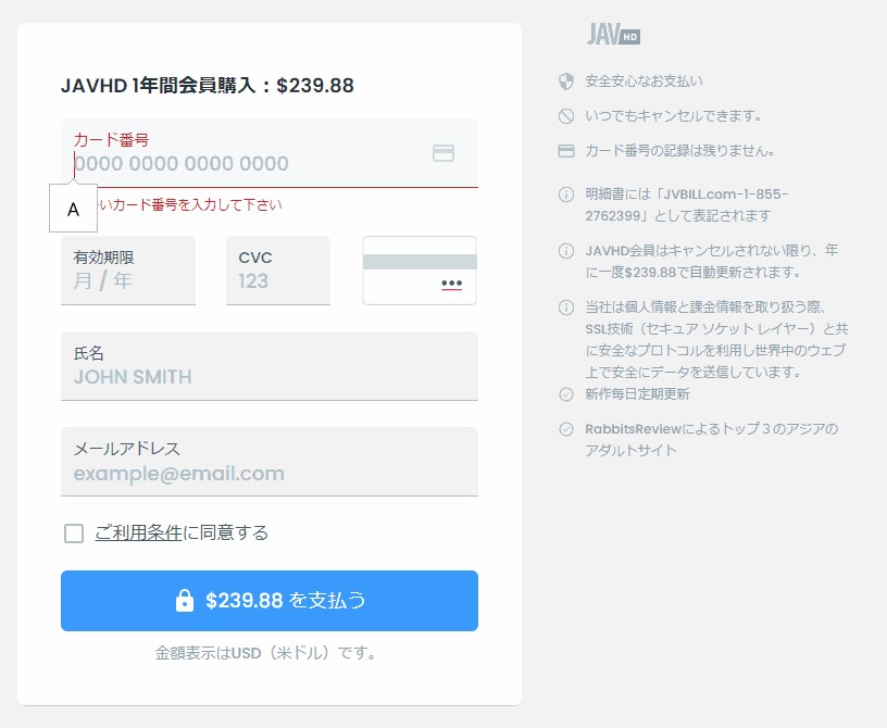 JAVHD にアクセスし「今すぐゲット」を押すと決済ページ(上の画面)が表示されます。