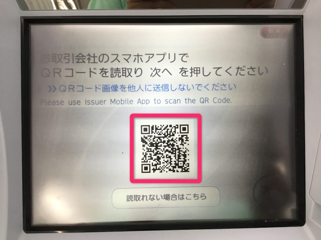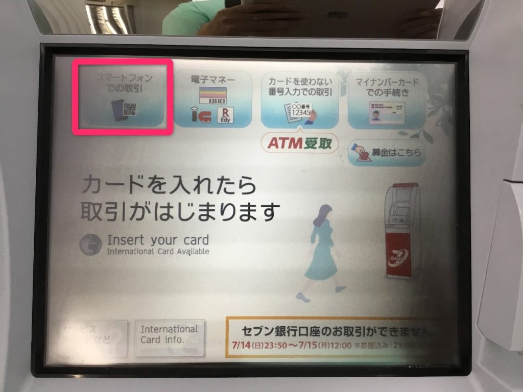 セブン銀行ATM画面左上の「スマートフォンでの取引」