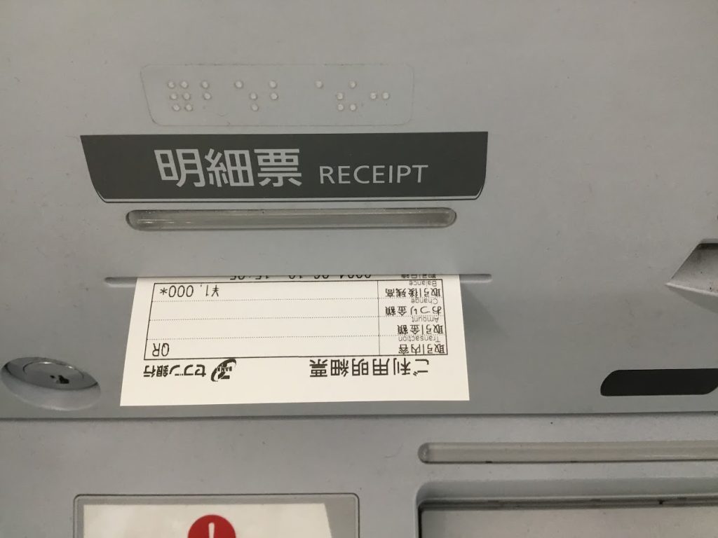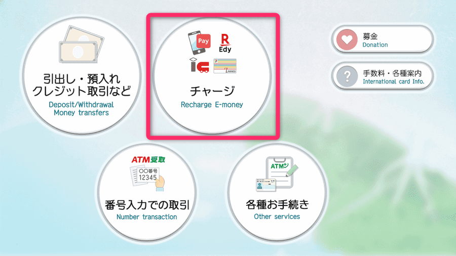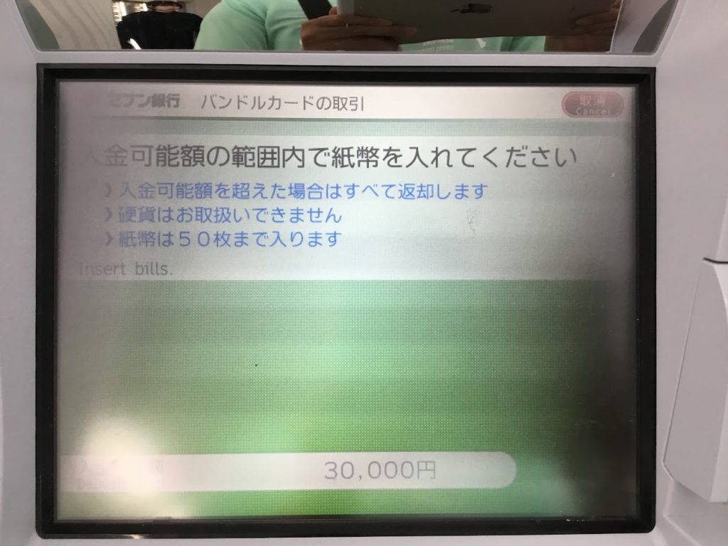 ATM画面の指示に従い、チャージ金額を入金しましょう。1000円札単位です。小銭でのチャージはできません!!!